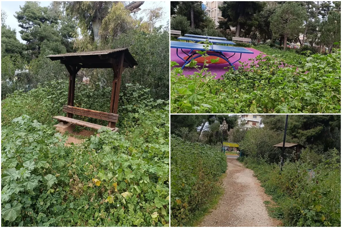 Ένα από τους κεντρικότερους «πράσινους πνεύμονες» της πόλης βρισκεται σε παραμέληση, καθώς η μη-περιποίηση του πρασινου έχει οδηγήσει σε συνθήκες «ζούγκλας». Τα χόρτα έχουν φτασει πάνω απο το 1 μέτρο, με χαρακτηριστικότερη να ειναι η εικόνα όπου ένας τραπεζοπαγκος κινδυνεύει κυριολεκτικά να σκεπαστει από την πυκνή βλάστηση, με τα φυτά να έχουν σκεπάσει ακόμα και το μονοπάτι προς αυτόν.