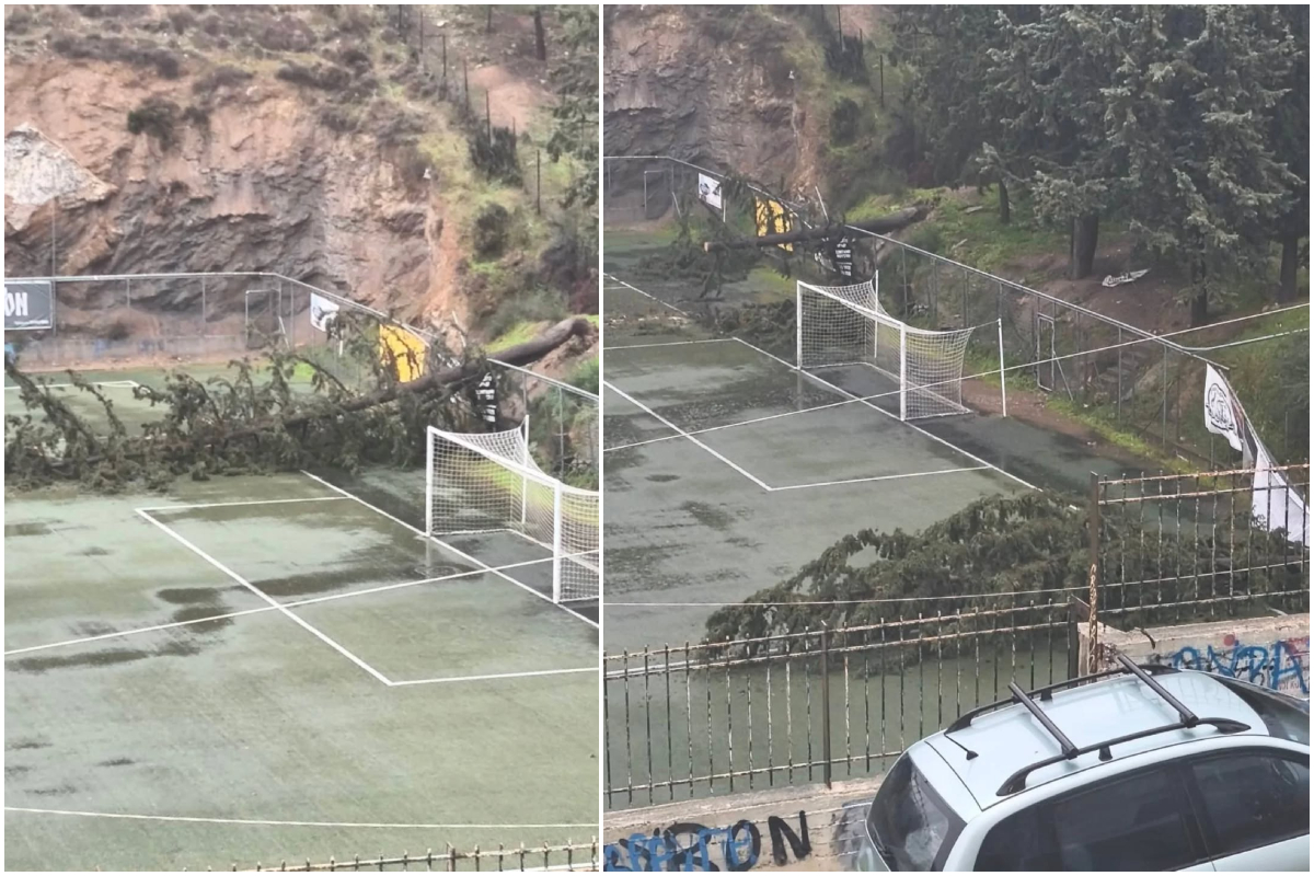Πτώση δύο ψηλών δέντρων πραγματοποιήθηκε στη βόρεια περίφραξη του Β’ Δημοτικού Γηπέδου Ηλιούπολης, προκαλώντας ζημιές στους φράχτες πίσω από τη μία εστία.