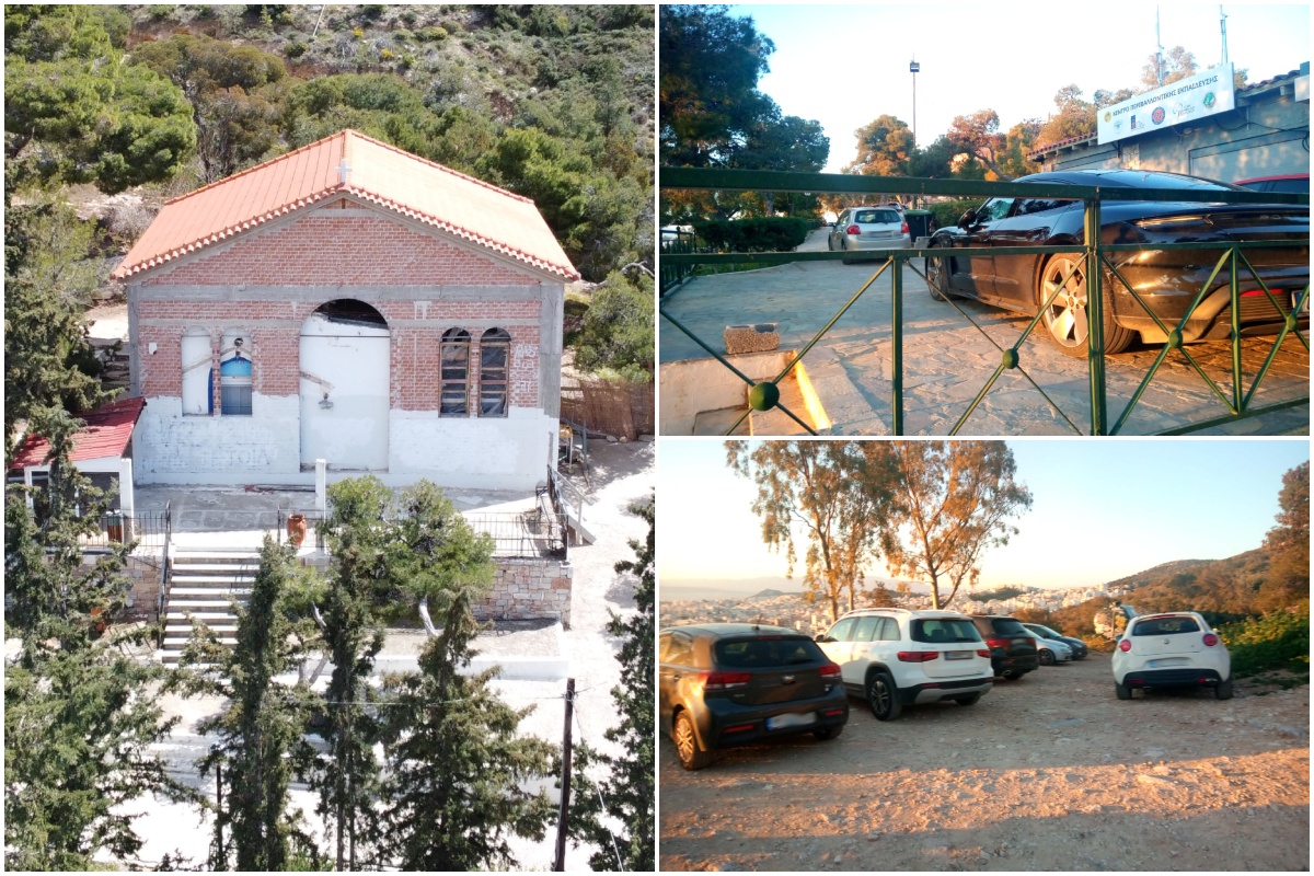 Σταση 2: Απόγευμα Μ. Τρίτης, Προφήτης Ηλία Ηλιούπολης. Η δασική έκταση γύρω από το εκκλησάκι και το παράνομο κτίσμα που το περιβάλλει έχει μετατραπεί σε υπαίθριο πάρκινγκ. Το Δασαρχείο απόν. Η Πολιτική Προστασία του Δήμου απούσα. Η Δημοτική Αστυνομία απούσα. Δεκάδες παρεβρισκόμενοι (ανάμεσά τους ηλικιωμένοι και παιδιά) έχουν προσέλθει στην παράνομη κατασκευή- ρημάδι, με δοκάρια και δομικά υλικά να κρέμονται πάνω από το κεφάλι τους.