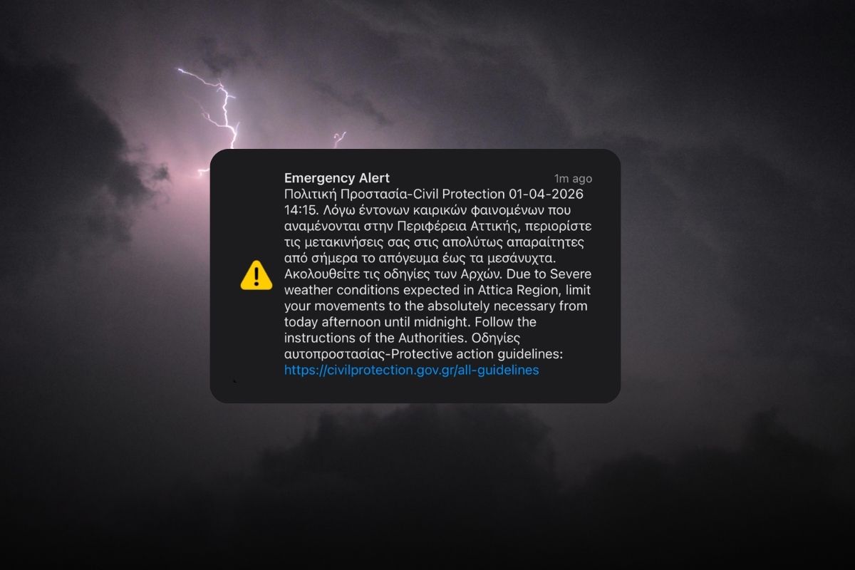 Το μήνυμα, το οποίο εστάλη στις 14:15, προειδοποιεί για εξαιρετικά έντονα καιρικά φαινόμενα που αναμένεται να πλήξουν την Αττική τις επόμενες ώρες. Συγκεκριμένα, οι πολίτες καλούνται να περιορίσουν τις μετακινήσεις τους στις απολύτως απαραίτητες, από νωρίς το απόγευμα έως το τα μεσάνυχτα.
