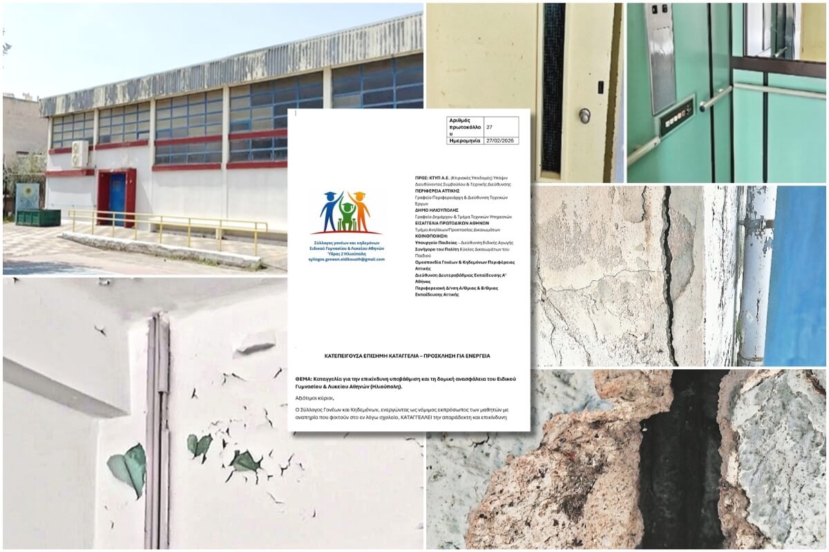 Σε κατεπείγουσα επίσημη καταγγελία για την επικίνδυνη υποβάθμιση και τη δομική ανασφάλεια των κτιριακών εγκαταστάσεων του Ειδικού Γυμνασίου και Λυκείου Αθηνών, το οποίο εδρεύει στην Ηλιούπολη, προχώρησε ο Σύλλογος Γονέων και Κηδεμόνων. Η επιστολή, με ημερομηνία 27 Φεβρουαρίου 2026, απευθύνεται μεταξύ άλλων προς την ΚΤΥΠ Α.Ε., την Περιφέρεια Αττικής, τον Δήμο Ηλιούπολης και την Εισαγγελία Πρωτοδικών Αθηνών.